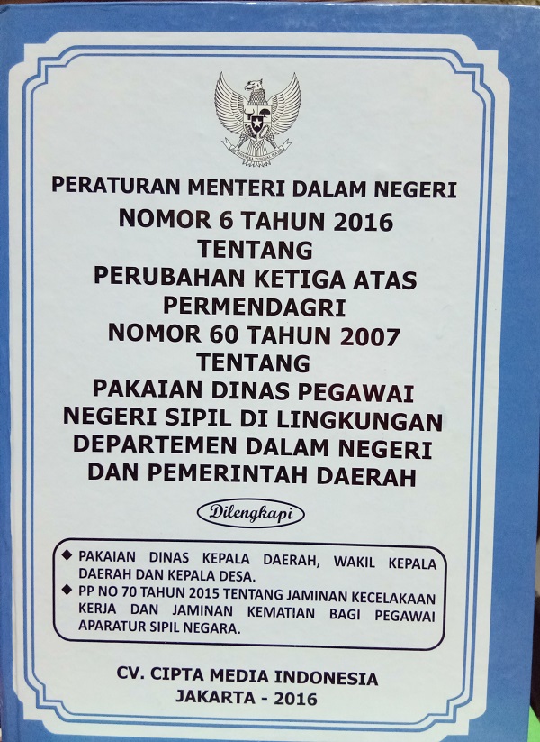 | Title | Peraturan Menteri Dalam Negeri Nomor 6 Tahun 2016 tentang Perubahan Ketiga Atas Permendagri Nomor 60 Tahun 2007 tentang Pakaian Dinas Pegawai Negeri Sipil di Lingkungan Departemen Dalam Negeri dan Pemerintah Daerah |