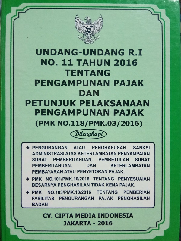 | Title | Undang-Undang RI No 11 Tahun 2016 tentang Pengampunan Pajak dan Petunjuk Pelaksanaan Pengampunan Pajak (PMK No.118/PMK.03/2016) |