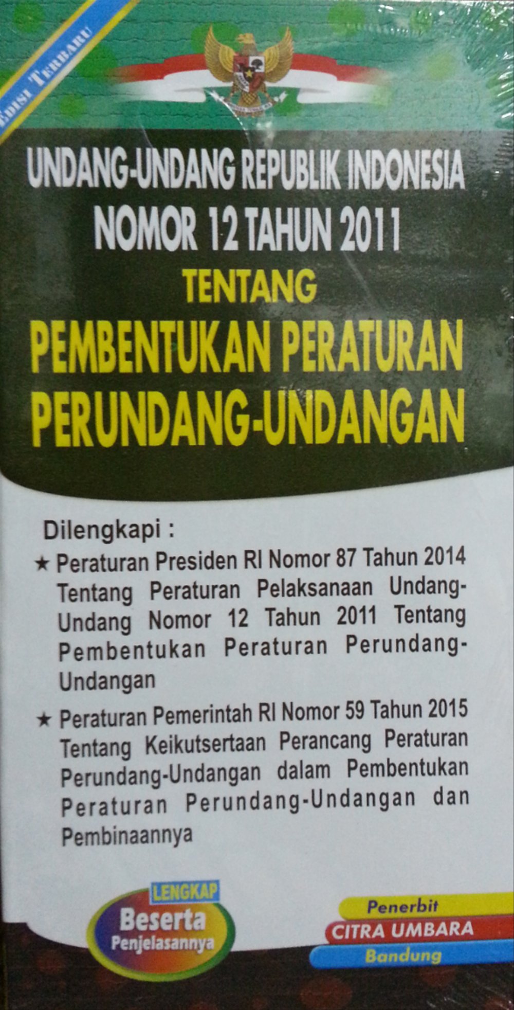| Abstract/Notes | Buku ini dilengkapi dengan: 1. Peraturan presiden RI No 87 th 2014 ttg peraturan pelaksanaan UU No 12 tahun 2011 ttg pembentukan peraturan perundang-undangan; 2. peraturan pemerintah RI No 59 th 2015 ttg keikutsertaan perancangan peraturan perundang-undangan dalam pembentukan peraturan perundang-undangan dan pembinaanya. |