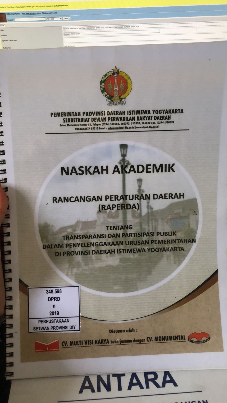 | Abstract/Notes | disusunnya NA ini agar materi naskah akademik yang memuat konsep-konsep, gagasan, dan pemikiran dasar ini dapat digunakan sebagai pertimbangan dalam rangka penuangannya dalam suatu Rancangan Peraturan Daerah tentang Transparasi dan Partisipasi Publik. memberikan argumentasi akademik kepada Pemerintah Provinsi DIY tentang urgensi dan kerangka pembentukan peraturan daerah tentang transparasi dan partisipasi publik. menyerap aspirasi tentang transparansi dan partisipasi publik |